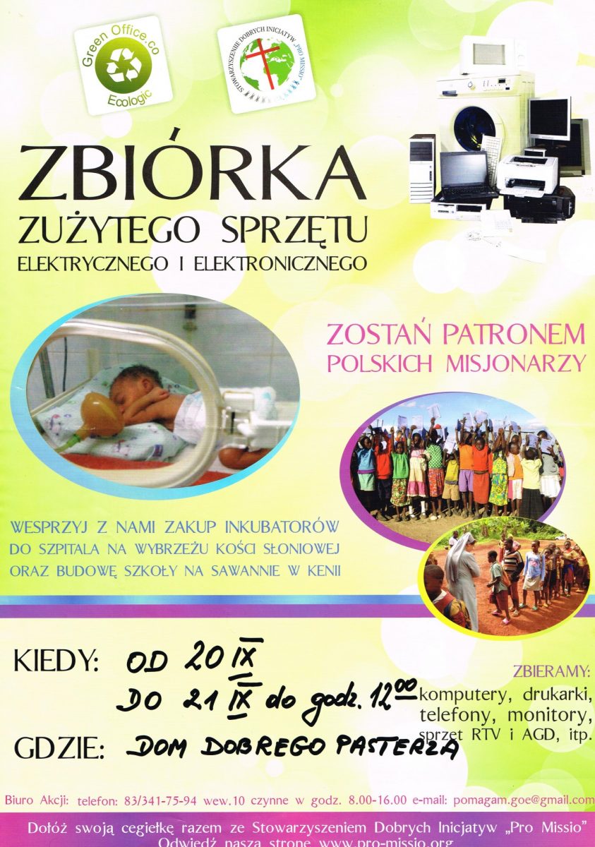 W piątek 21 września, będzie miała miejsce zbiórka zużytego sprzętu elektrycznego i elektronicznego. Przychody z akcji pozwolą na wsparcie zakupu kolejnych nowoczesnych inkubatorów do Szpitala na Wybrzeżu Kości Słoniowej w Afryce, a także objęcie nowego projektu wspólnie ze Stowarzyszeniem Dobrych Inicjatyw „Pro Misio” – dofinansowanie Budowy Szkoły na Sawannie w Kenii.