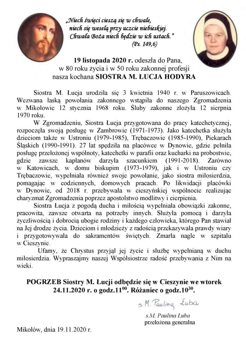 Z bólem zawiadamiamy Parafian, że w dniu 19 listopada br. zmarła s. Łucja Hodyra, która przez 27 lat gorliwie pracowała w naszej parafii. Wierzymy, że jej śmierć jest odejściem do Pana, któremu służyła przez całe swoje życie (80 lat), w tym przez 50 lat jako profeska w Zgromadzeniu Sióstr Miłosierdzia Św. Karola Boromeusza.